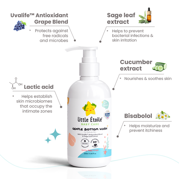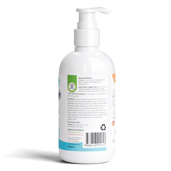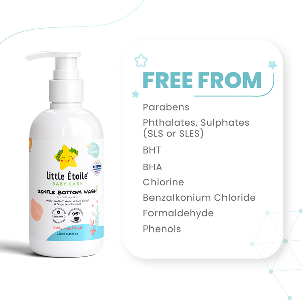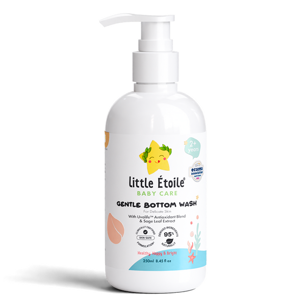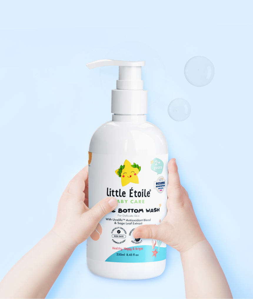 Safety first with Little Étoile® Care – our Gentle Bottom Wash has been dermatologically tested and is safe for sensitive skin.