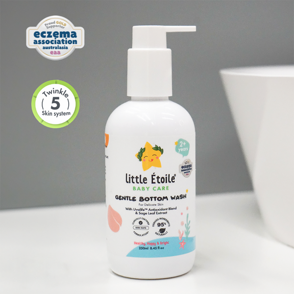 Little Étoile Gentle Bottom Wash was shown to be safe for sensitive skin in a study conducted by an accredited dermatology clinic on 54 Australian subjects. It showed no signs of skin irritation (score of 0/4 on a skin irritation scale) after contact with upper arm skin over 24 hrs, compared to distilled water.
