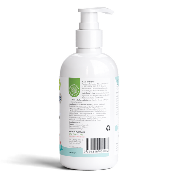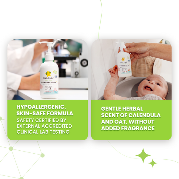 Little Étoile Nourishing Lotion was shown to be safe on sensitive skin in a study conducted by an accredited dermatology clinic on 54 Australian subjects. It showed no signs of skin irritation (score of 0/4 on a skin irritation scale) after contact with upper arm skin over 24 hrs, compared to distilled water. Read full report.(Reference: Ozderm Pty Ltd. 20230914, protocol MBC01, pp1-23)