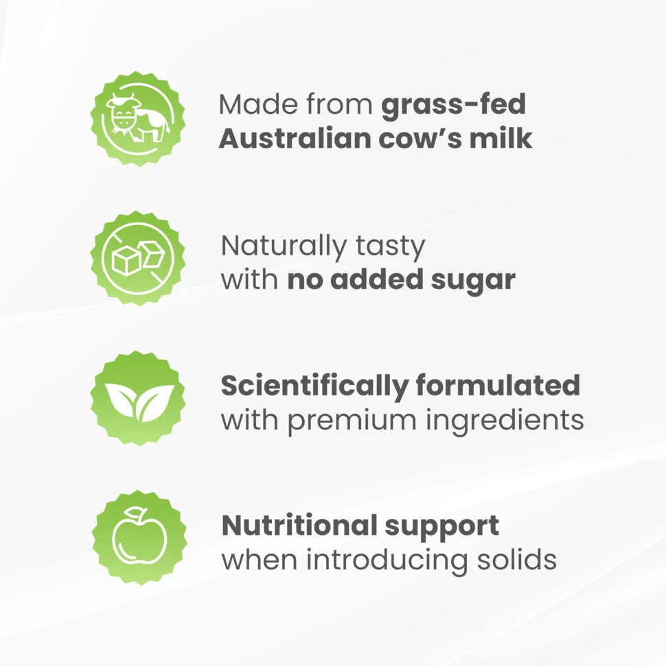 All our formula products use premium Australian milk from grass-fed cows, which has been shown in research to have higher nutritional content than milk from conventionally fed cows and organic milk. *Alothman M et al. Foods. 2019;8(8):350.