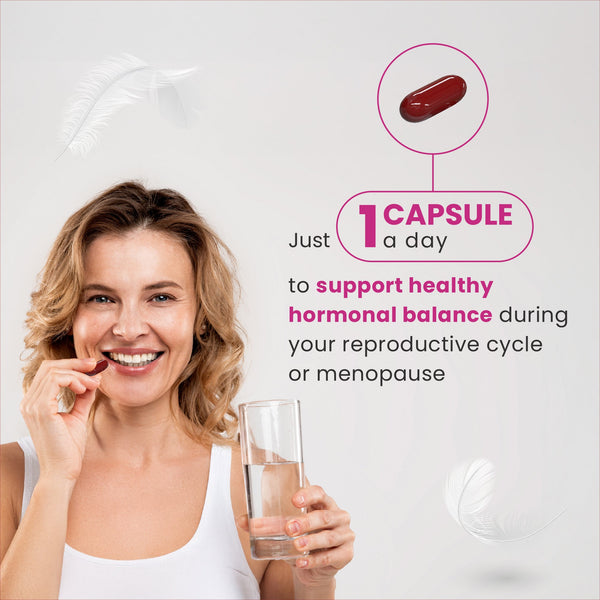 Just 1 capsule a day to support healthy hormonal balance during the reproductive cycle or menopause